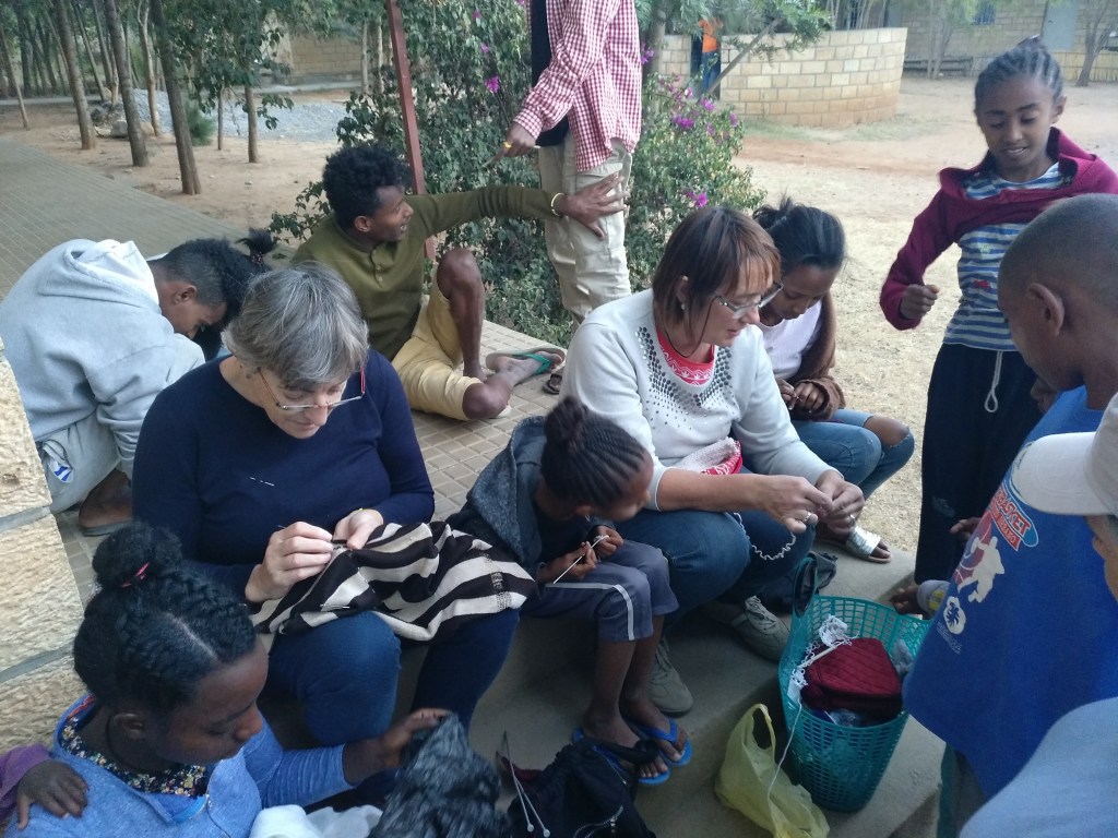 Como en veces anteriores, llevamos nuestros ganchillos y materiales de costura para darle un impulso a la iniciación de las chicas y chicos en estas tareas tan necesarias y útiles. Desde la reparación de sus maltrechos jerseys del uniforme escolar hasta la elaboración de pequeñas prendas de punto.