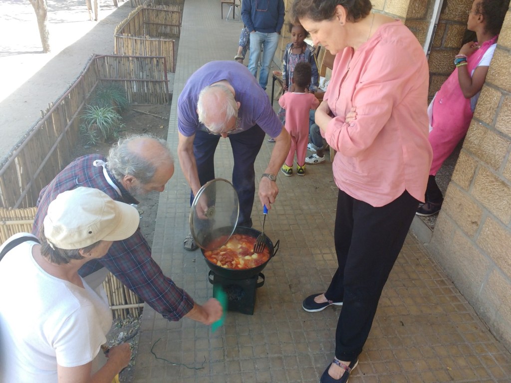 Un par de día preparamos comida especial para todos (patatas con chorizo, migas, compota, chocolatada) y especialmente para el Abba navarro José Luis Bandrés que lleva más de 50 años en el Tigray y que vino a visitarnos. Junto a Ángel Olaran, este padre blanco montó lo que hoy es la Institución St. Mary.