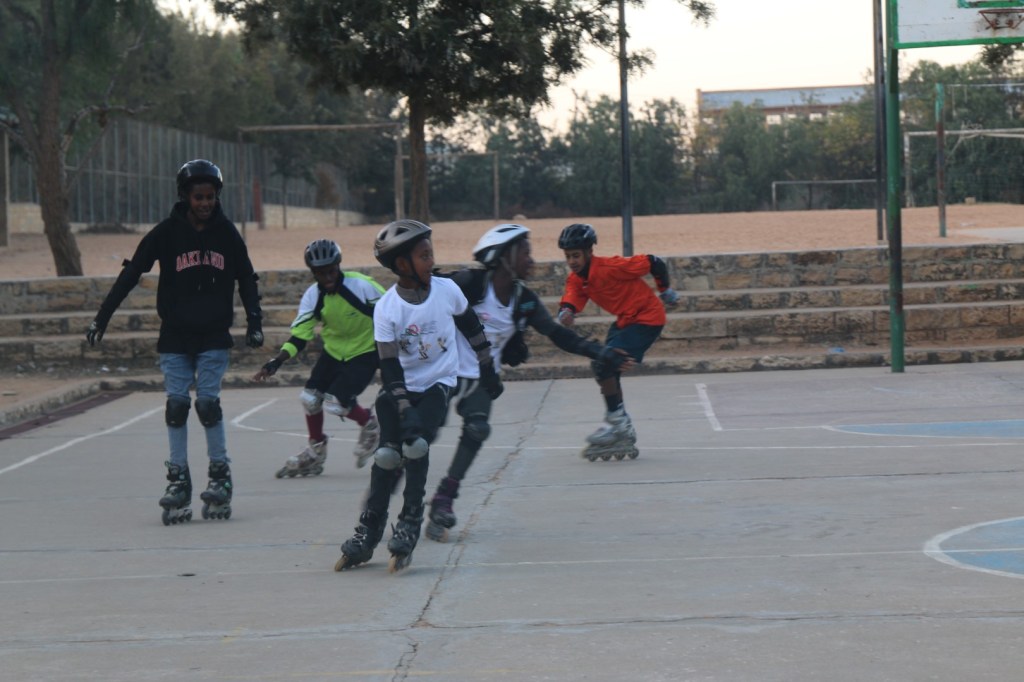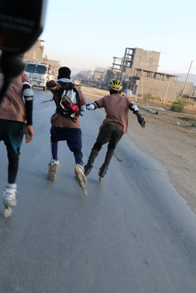 Para aprovechar la conyuntura de la situación en Wukro con la pandemia (que por suerte ahora mismo sigue sin aparecer en esa zona) nuestros patinadores mayores siguen saliendo con más facilidad a patinar a la carretera, ahora mismo más libre de tráfico pesado y peligroso. Como toda la Escuela, la única pequeña pista polivalente de St. Mary está cerrada.