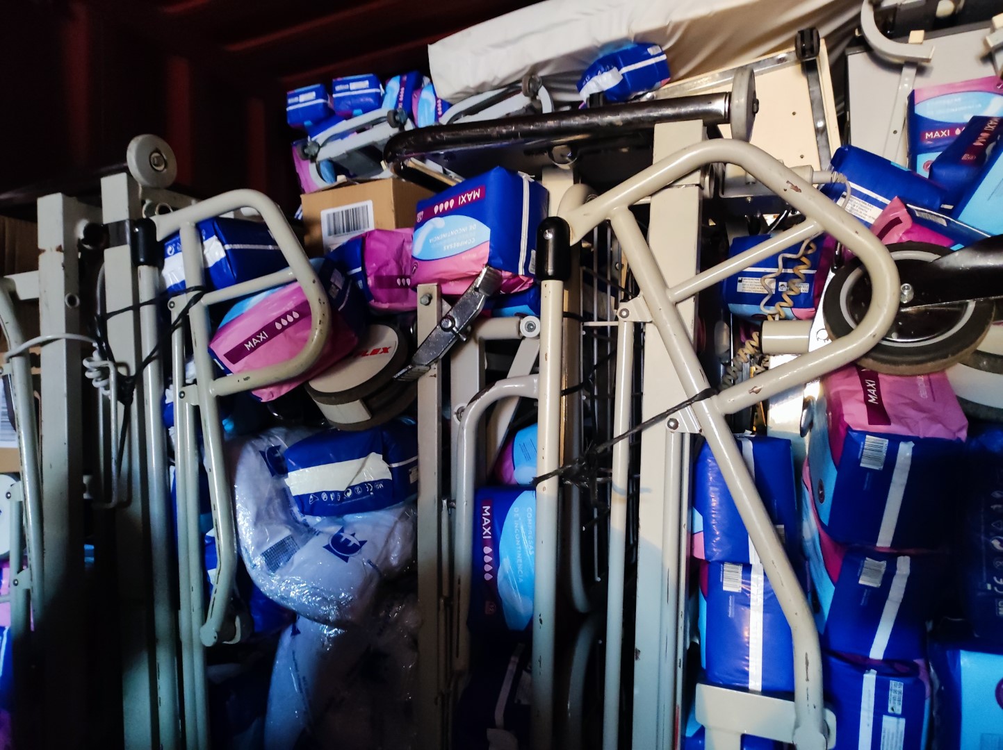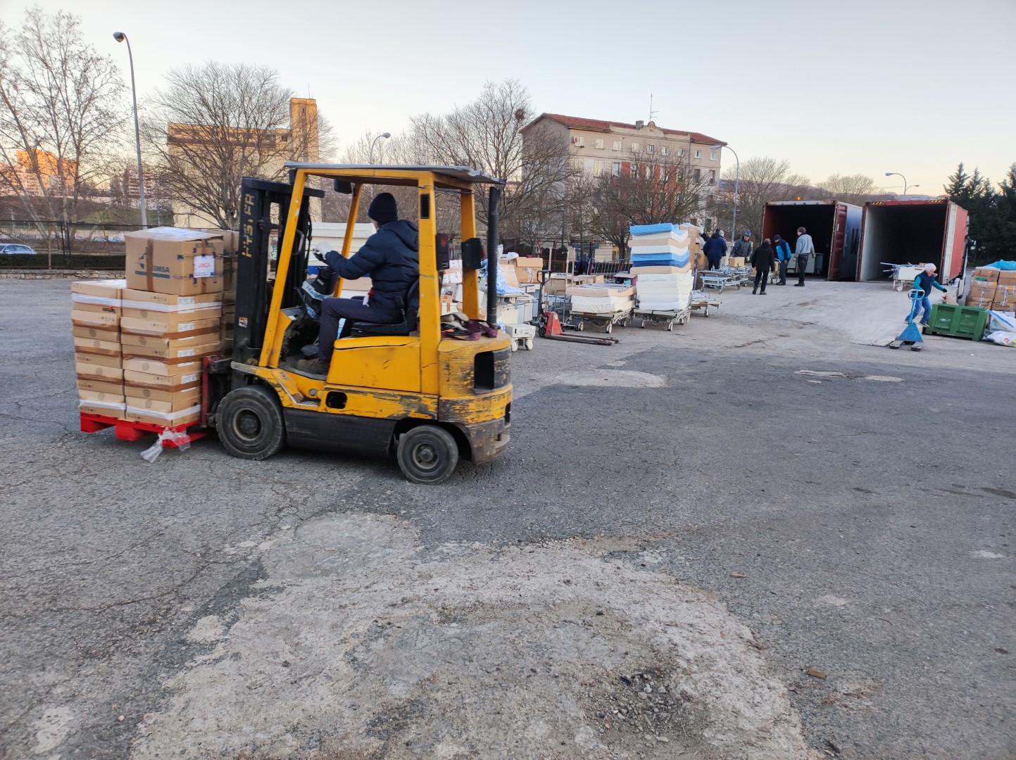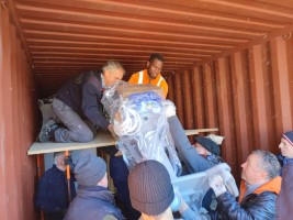 Con todo el mimo y cuidado se ha procedido a la carga -con la increíble maestría del voluntariado de Ayuda Contenedores- para dar cabida ordenadamente y con la cuidada protección necesaria para algunos materiales tan sensibles.